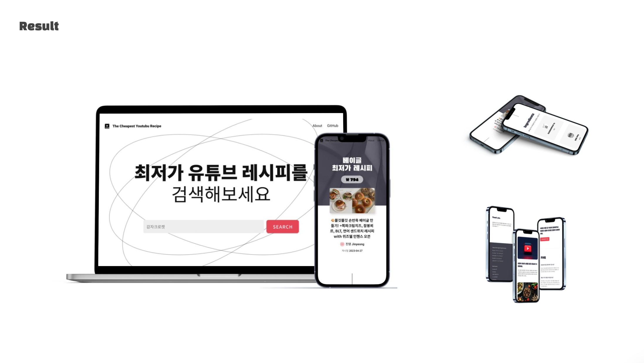 사용자가 요리하고자 하는 음식을 검색하면 가장 저렴한 재료 및 용량을 제공하는 요리 레시피를 찾아줍니다. 사용자는 검색을 통해 원하는 요리를 입력하면, 이 때 사전에 수집된 레시피 정보와 최신 식료품 가격 정보를 분석하여 최저가 레시피를 제시합니다.