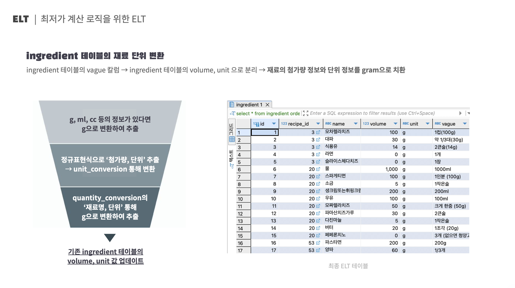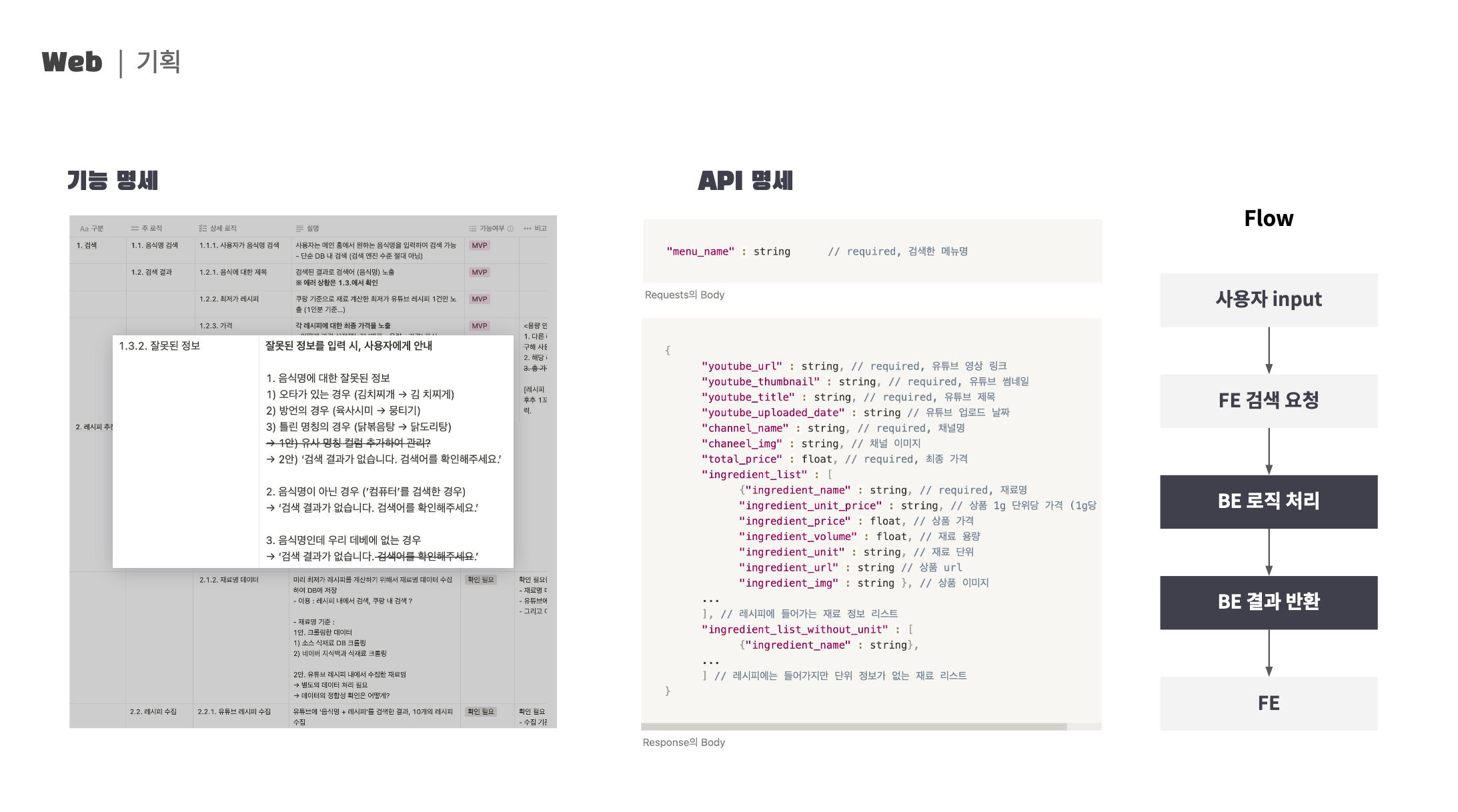 이를 위해 API와 크롤링을 통해 데이터를 수집하고, Airflow로 스케줄링을 했습니다. Gemini와 같은 AI 툴을 이용하여 데이터 변환을 거치고 menu, recipe, ingredient 데이터를 적재하여 최저가 가격 산출을 위한 로직에 사용되었습니다.