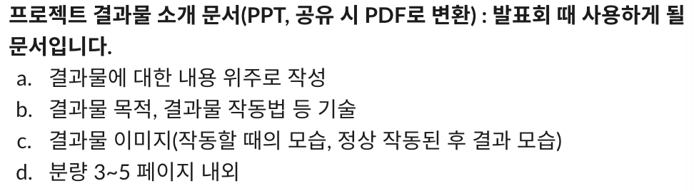 최종 프로젝트를 마무리하는 과정으로 (1) 프로젝트 보고서, (2) 결과물 소개 문서를 제작했다. 그리고 결과물 소개 문서를 바탕으로 발표회에서 (3) 발표도 진행했다.