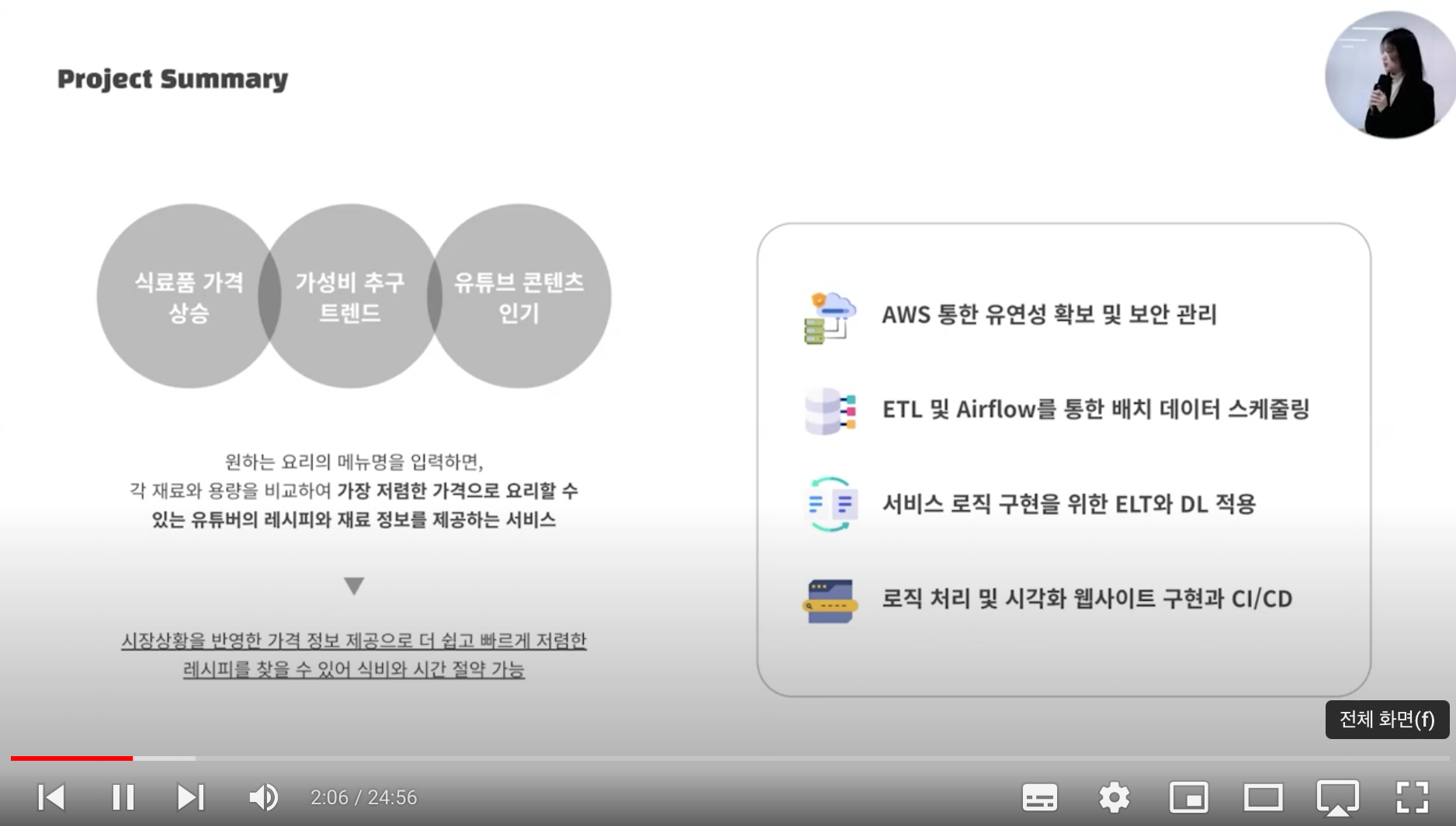 이 프로젝트는 최저가 유튜브 레시피 검색 서비스를 개발하는 것을 목표로 하였습니다. 현재 경제 상황으로 인해 식료품 가격이 상승하고 있으며, 이에 따라 소비자들은 가성비 있는 요리 레시피를 찾는 수요가 증가하고 있습니다.